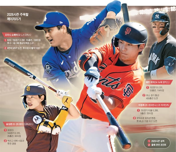 WBC(월드베이스볼클래식)에서 예열을 끝낸 세계 최고의 야구 스타들이 팀당 162경기를 치르는 장기 레이스에 들어간다. 미 프로야구 메이저리그(MLB)가 26일(한국 시각) 캘리포니아주 샌프란시스코에서 홈팀 자이언츠와 뉴욕 양키스의 맞대결로 개막한다. 이어 27일 미국과 캐나다에서 14경기가 동시에 열린다. LA 다저스가 막강한 전력으로 월드시리즈 3연패(連霸)에 도전장을 던진 가운데 오타니 쇼헤이(다저스), 애런 저지(양키스), 후안 소토(뉴욕 메츠) 등 수퍼스타들의 새로운 기록 도전에 야구 팬들의 관심이 쏠린다. 한국인 메이저리거의 활약을 기대하는 사람이 많지만, 개막 로스터에는 이정후(자이언츠)가 유일하게 포함됐다.