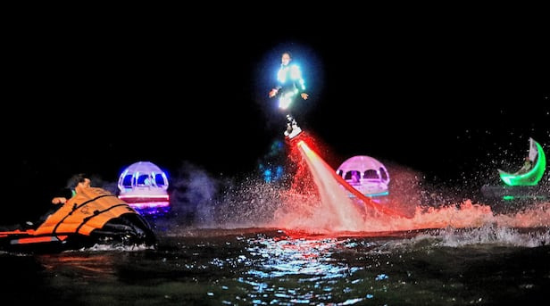 9일 밤 강원 인제군 남면 빙어호에서 ‘여름애(愛) 인제애(愛) 빠지다’ 축제가 열렸다. 플라이보드 박진민 선수가 호수 위를 나는 공연을 하고 있다. 플라이보드는 강한 물줄기를 내뿜는 보드를 타고 수면 위를 날아다니며 곡예를 하는 스포츠다.