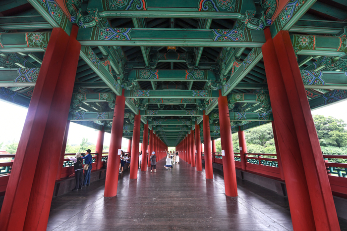 그렇게 월정교 앞에 다다랐다. 510억 원이라는 큰 예산을 들여 10여 년간의 조사와 고증을 거쳐 2018년 복원을 완료한 월정교는 지붕 덮인 다리인 '누교(樓橋)'이다. 햇빛은 가려주고 바람은 통하게 한 덕분인지, 더운 날씨에도 불구하고 입구에서부터 시원한 강바람이 불고 있었다. 그리고 거기에서 우리는 운명처럼, 사랑에 빠진 한 남자를 만났다.