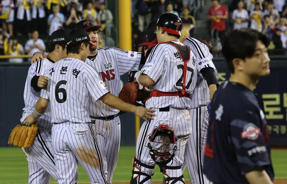 70승 선착 1위 LG ‘맑음’. 프로야구 3강 구도가 요동친다. LG(위 사진)가 신바람 야구로 앞서가는 가운데, 한화는 제자리걸음 중이다. 롯데는 투타 불균형으로 최근 10연패 수렁에 빠졌다. [뉴스1]