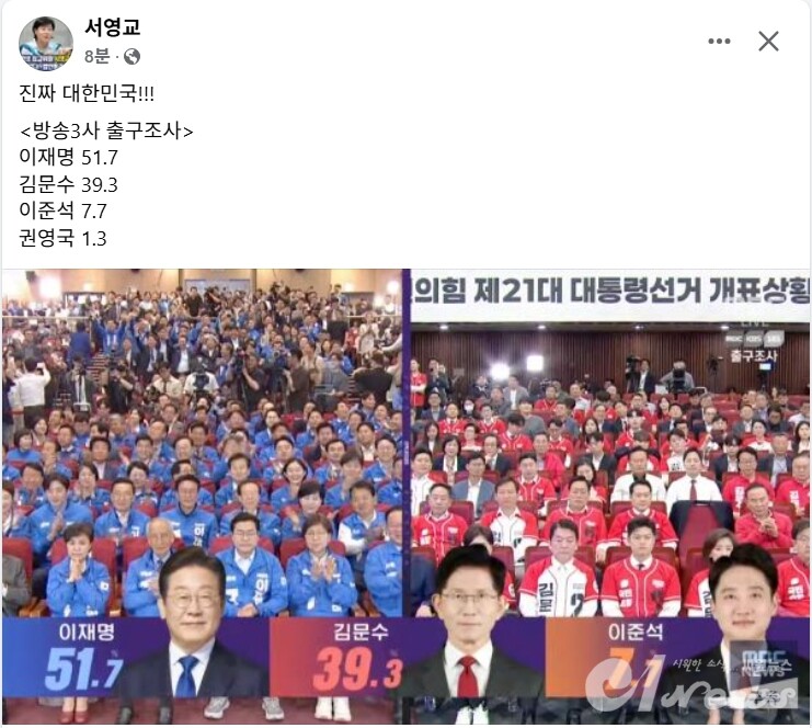 이재명 51.7% 김문수 39.3% 이준석 7.7% 라고 발표 했다.