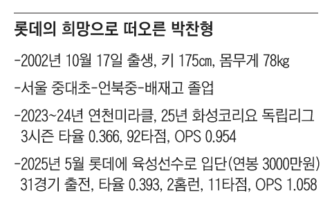동점 아치로 사직을 열광에 빠뜨린 박찬형은 지난 5월 연봉 3000만원에 육성 선수로 롯데 유니폼을 입었다. 프로로 오는 길은 결코 순탄치 않았다. 배재고 시절 두각을 나타내지 못해 2021 KBO(한국야구위원회) 신인 드래프트에서 지명받지 못한 그는 대학 진학 대신 현역 군 복무를 택했다. 전역 후엔 독립 리그로 향해 2023년부터 연천 미라클과 화성 코리요에서 활약하며 3년간 타율 3할 6푼을 기록하며 묵묵히 꿈을 이어갔다. 그러다 야구 예능 ‘불꽃야구’를 통해 팬들에게 얼굴을 알리면서 기회가 찾아왔다. 함께 출연한 이대호와 정근우 등 레전드 선수들은 박찬형을 보며 “왜 프로에 안 가고 여기 있느냐”고 놀라워했고, 그들의 평가는 곧 현실이 됐다.
