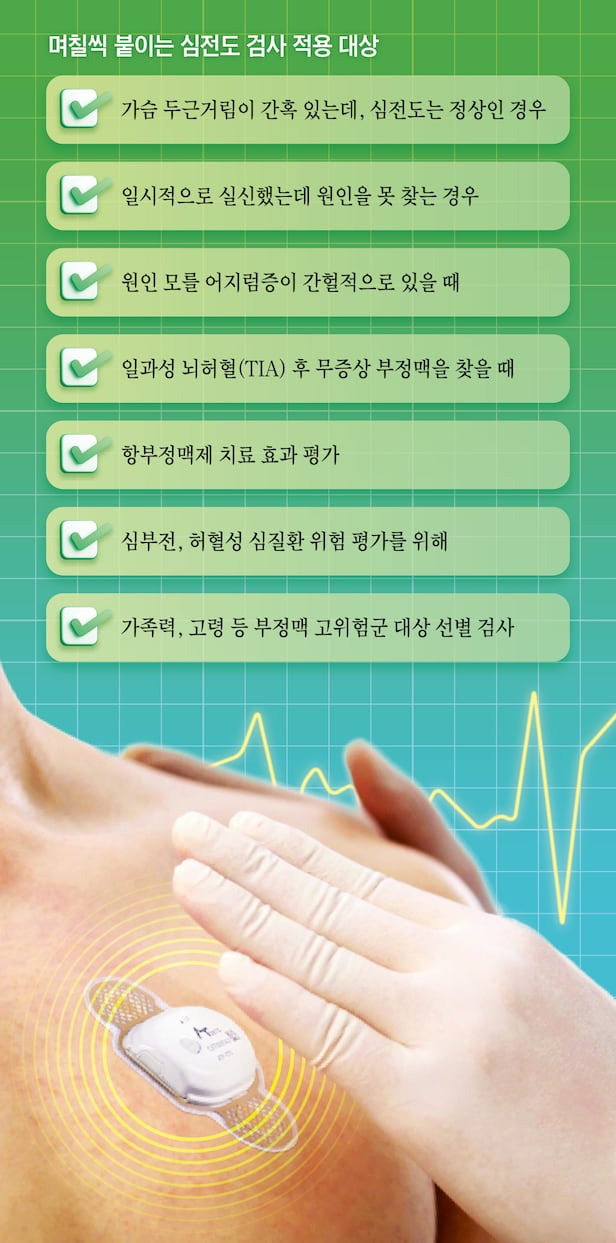현재 심전도 패치는 건강보험이 적용되며, 환자 부담은 2~14일 붙이는 기간에 따라 3만~16만원이다. 적용 대상은 주로 가슴 두근거림이 간혹 발생되어 심방세동이 의심되나 심전도는 정상인 경우, 실신을 했는데 원인을 못 찾는 경우, 원인 모를 어지럼증이 간헐적으로 있을 때, 일과성 뇌허혈(TIA) 증세 후 무증상 부정맥을 찾을 때 등이다<그래픽 참조>.