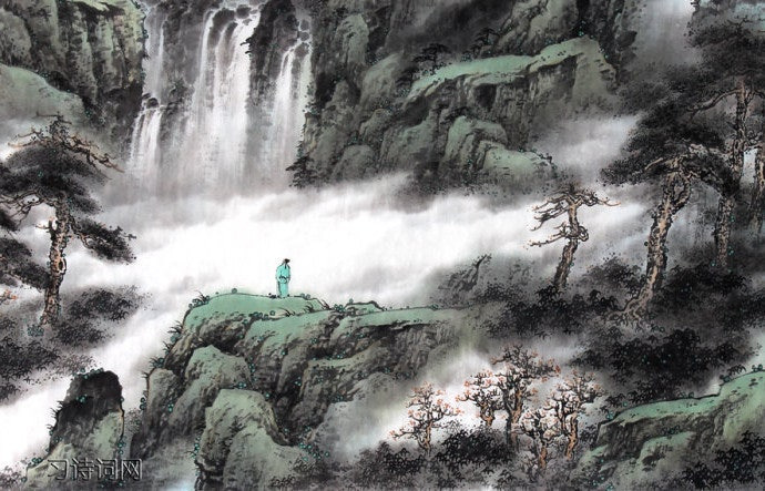 遙看瀑布掛前川 (요간폭포괘전천)。