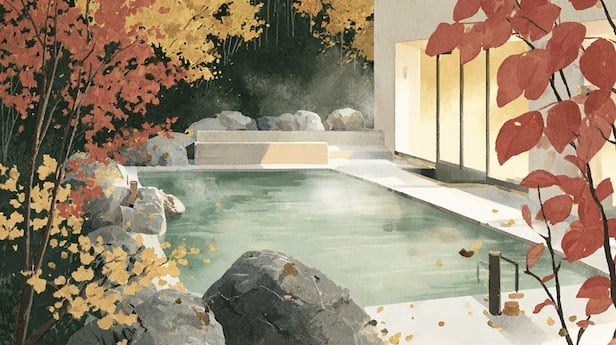 발끝으로 살짝 물의 온도를 감지하곤 얼른 뛰어들어 턱까지 몸을 담그면, 아, 여기가 천국이로구나, 감탄이 절로 나며 전신이 나른해진다. 머리는 여전히 시베리아에서 불어온 매서운 바람 속에 있는데 몸은 42도가 넘는 열탕 속이니, 그 온도 차로 온천물이 몸속에서 빙글빙글 도는 듯하다. 귓가에는 찰랑거리는 물소리, 어디선가 새소리도 들려온다. 바람결에 나부끼는 나뭇잎의 군무도 아름답다.