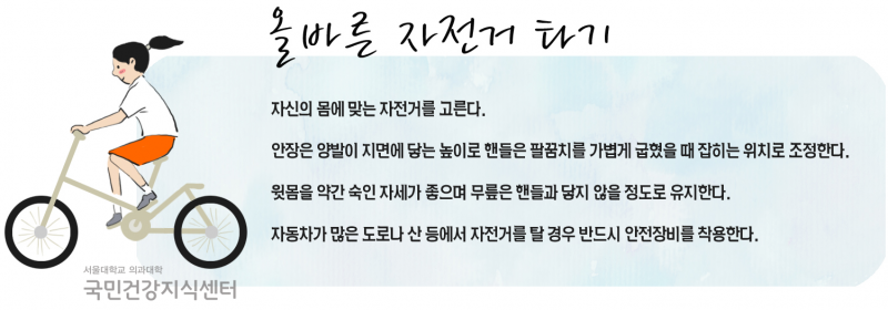 남녀노소 누구나 즐기기 쉬운 레포츠인 자전거. 자전거의 가장 큰 매력은 크게 힘들이지 않고 즐기면서 운동할 수 있다는 것이다. 자전거 타기는 유산소운동과 동시에 근력운동이 가능하다. 걷기나 달리기 같은 유산소운동은 무릎과 발목관절에 체중 부하를 주지만, 자전거는 앉아서 타는 만큼 무릎관절 등에 부담 없이 즐길 수 있는 운동이다. 자전거를 타면 모세혈관이 굵어져 혈액의 흐름을 원활하게 해줌으로써 혈압을 낮춰준다. 따라서 혈액순환이 제대로 안되어 생기는 손발 저림, 고혈압 등에 매우 효과적이다. 혈액순환이 개선되면 뇌에 원활한 혈류공급이 이루어져 뇌혈관질환의 예방에도 큰 도움이 된다. 또한 몸에 나쁜 콜레스테롤을 줄여주어 동맥경화증의 예방에도 좋다.