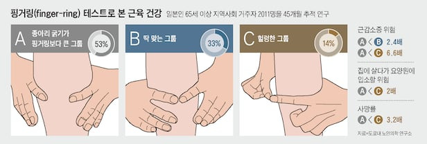 도쿄대 노년의학과 이이지마 가쓰야 교수 연구에 따르면, 손가락 반지가 딱 맞는 종아리 그룹은 근감소증 위험이 2.4배, 헐렁한 종아리 그룹은 6.6배 높았다(그래픽 참조). 헐렁한 종아리 그룹 노인은 추적 기간 사망률이 3.2배 높았다. 자기 집에서 살다가 결국 요양원에 들어가는 비율도 2배 높았다.