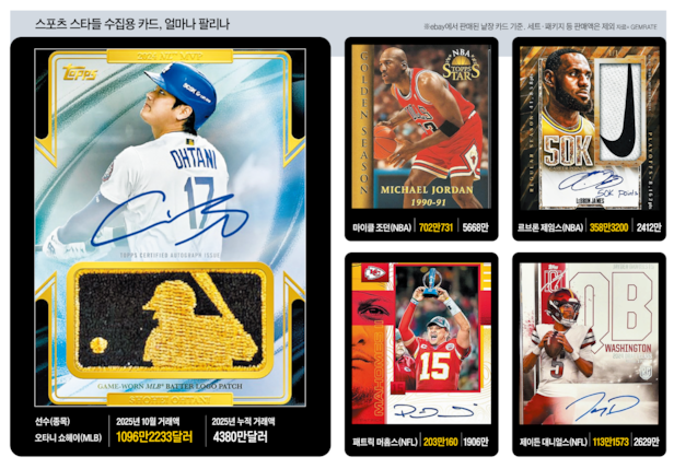 오타니 쇼헤이(31·LA 다저스)는 올 시즌 MLB(미 프로야구) NLCS(내셔널리그 챔피언십시리즈) 4차전에서 전 세계 스포츠 팬들의 마음을 사로잡았다. 선발 투수로 나와 6이닝 10탈삼진의 역투를 펼치는 동시에 타석에서는 홈런 세 방을 몰아치며, 스포츠 역사에 길이 남을 ‘원맨 쇼’를 완성한 것이다. 올가을 다저스의 월드시리즈 2연패(連覇)를 이끌며 높아진 그의 위상은 스포츠 카드 시장에서도 고스란히 드러난다. 3일(현지 시각) 미국 스포츠 일러스트레이티드(SI)는 “지난 10월 온라인 마켓 사이트 ‘이베이’에서 오타니 카드의 월간 거래액이 1090만달러(약 161억원)를 기록하며 스포츠 카드 사상 월간 최고 기록을 새로 썼다”고 보도했다.