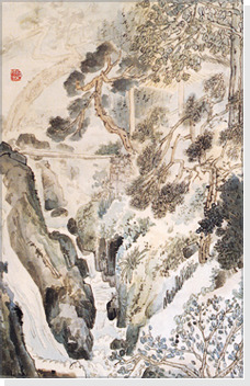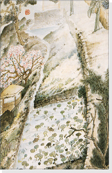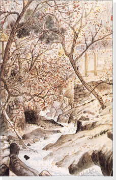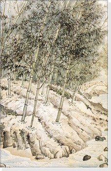 샘 줄기의 물 홈통을 뚫고 굽이쳐 흘러높낮은 대숲 아래 못에 내리네