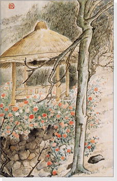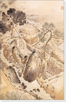 물고기와 주인의 화순한 모습을 그렸다. 상류에서 나무홈통으로 뽑아내린 물이 소정 바로 옆에 있는 작은 연못으로 흘러든다. 여기서 고기들은 주인과 더불어 즐긴다. 물고기가 물을 떠나서 살 수 없듯 사람은 '도'를 떠나서 살 수 없다는 관어도觀魚圖의 일단이다.