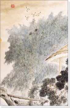 장설의 시에 이라고 한 것을 바탕으로 하였다. 고요한 저녁노을을 배경으로 흔들리는 나무가지를 거울에 비친 것으로 비유하여 맑게 묘사하고 있다.