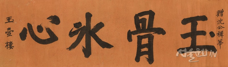 명성왕후 민씨(明成皇后 閔氏, 1851~1895)가 영의정 심순택에게 휘호해준 〈옥골빙심玉骨氷心〉(19세기 말, 150×40cm, 개인소장) / 경복궁의 건청궁 옥호루玉壺樓에서 명성황후가 영의정 심순택에게 하사한 휘호이다. 옥호루는 명성황후의 거처로서 여기서 일제 낭인에게 시해되었다. 치화穉華 심순택沈舜澤(1824~1906)은 사대부 중 유일무이하게 대한제국 공작으로 청녕공靑寧公에 봉작되었는데, 1897년 대한제국 수립 때 ‘대한大韓’이라는 국호를 주창한 최초의 인물이기도 하다. 1905년 러일전쟁에서 승리한 일제가 을사늑약을 강요하자 조병세의 자결自決과 의병 운동이 발발하는 가운데 반대 상소로 매국노를 규탄하였다.