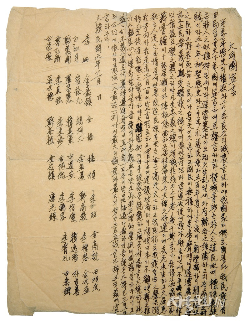 1919년 2월, 중국 지린성 일대에서 활동하던 대한독립의군부의 조소앙(趙素昻)이 기초하여 애국지사 39명이 대한독립을 선포한 〈대한독립선언서〉(1919년, 51.2×36.8cm, 개인소장)