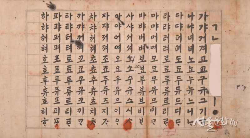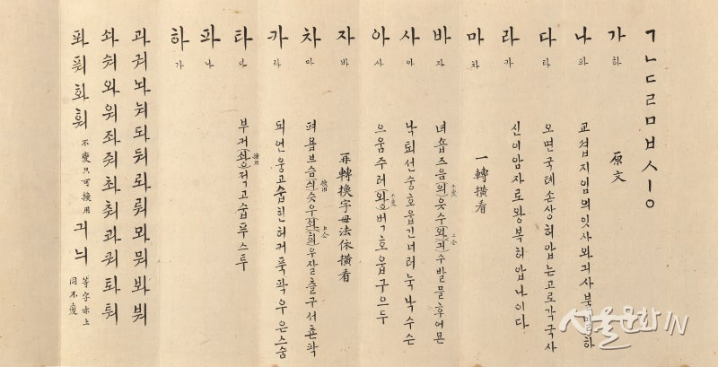 〈암호 편지〉(1890년경, 50.0×25.6cm, / 66.2×23.0cm, 동농문화재단 소장) / 주일공사관 판사대신 이학규(李鶴圭)가 보낸 편지의 말미에 “힘묭쟈츄을번푼슈뒤슨 슨 그훅냐”라고 적은 것은 “흠명쥬챠일본판샤대신(欽命駐箚日本辦事大臣) 신(臣) 니학규(李鶴圭)”의 모음을 회전시켜 쓴 것이다.