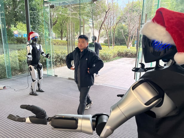 크리스마스 이브인 24일, 세계 휴머노이드(인간형) 로봇 양산 1위 기업인 중국 애지봇(AgiBot·智元機器人) 상하이 본사 1층 로비에는 산타클로스 대신 ‘로봇 산타’들이 가득했다. 입구에서는 붉은 모자를 쓴 휴머노이드 로봇 4대가 양옆에 서서 손을 흔들며 “환잉 리린(어서 오세요)”을 외쳤고, 로봇개는 방문객을 졸졸 따라다녔다. 로비 한가운데서는 바퀴 달린 휴머노이드 로봇 ‘징링(精靈) G1’이 크리스마스 선물을 정리하느라 분주했다. 한쪽 구석에 마련된 사내 카페에서는 대표 모델 ‘위안정(遠征) A2’ 로봇 세 대가 나란히 서서 북을 치고 차이다이(彩帶·색띠)를 흔들며 용무(龍舞)를 추고 있었다. 애지봇 관계자는 “오늘 하루에만 전 세계 바이어와 정부·기업 관계자 40팀이 다녀갔다”며 “직원들이 크리스마스 시즌에도 쉬지 못한다”고 했다.