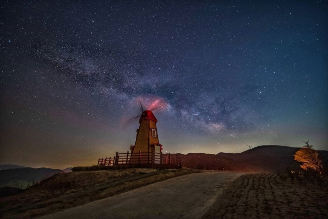 하늘전망대에서 2주차장으로 내려와 다시 20분 정도 걸으면 '풍차전망대'를 만난다. 전망대에서 북쪽을 바라보면 윤슬이 반짝이는 군위호의 전경이 한 눈에 들어온다. 군위호 너머에는 선암산, 매봉산, 방가산 등 뾰족한 산들이 병풍처럼 둘러서 있다.