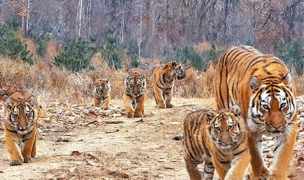 지난달 중국 지린성 훈춘시에 있는 ‘동북호랑이표범국립공원’에서 호랑이 가족이 공원에 설치된 카메라에 포착됐다. 암컷 호랑이가 새끼 5마리를 데리고 산길을 걷고 있다. 신화통신은 “야생 시베리아 호랑이 새끼 다섯 마리가 이렇게 발견된 건 처음”이라고 전했다.
