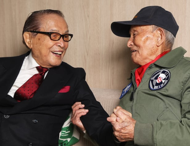 은발에 더블 수트로 멋을 낸 배우 신영균이 올해 백수(白壽)를 맞은 김두만 장군 손을 힘주어 잡았다. “한해 위인데도 저보다 훨씬 젊어 뵈십니다.” 김 장군은 ‘케데헌’으로 골든 글로브를 휩쓴 신영균의 손녀 이재씨를 축하했다. “역경을 딛고 일어선 젊은이더군요. 얼마나 자랑스러우십니까?”