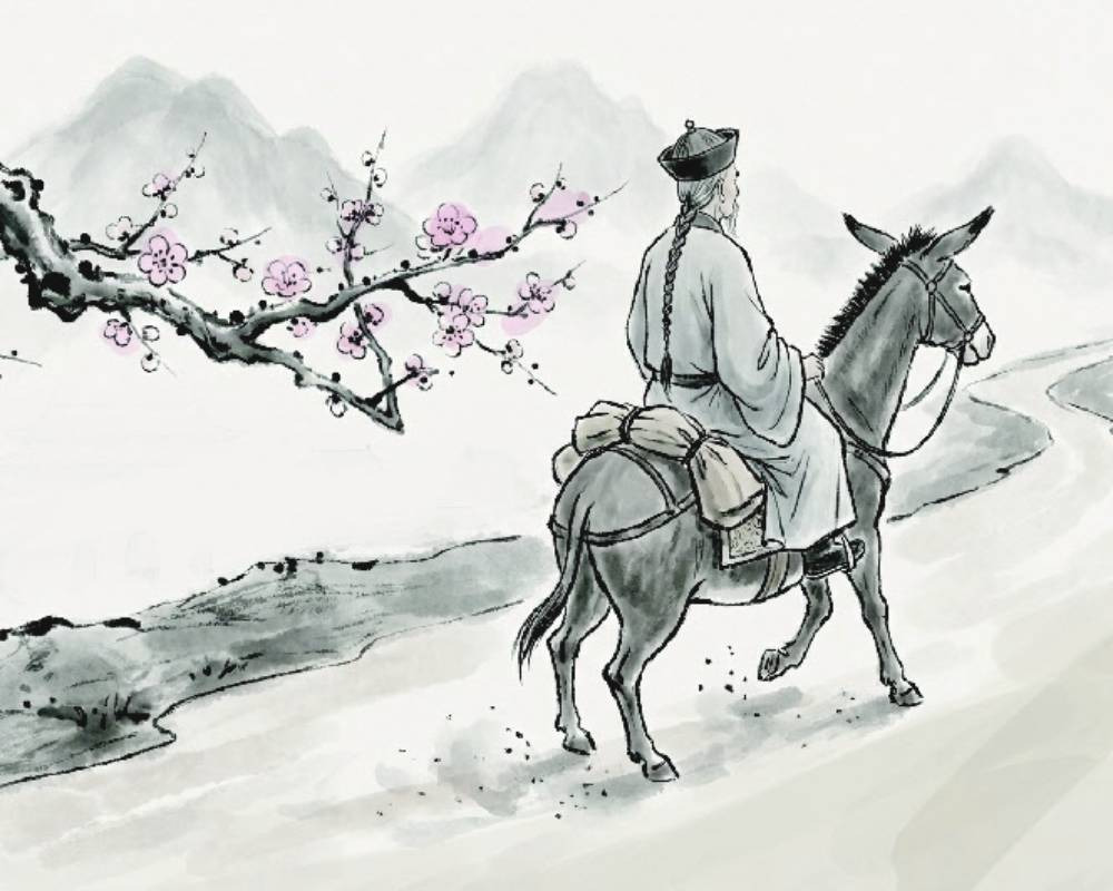 (白頭風雪上長安, 裋褐疲驢帽帶寬. 辜負故園梅樹好, 南枝開放北枝寒.)