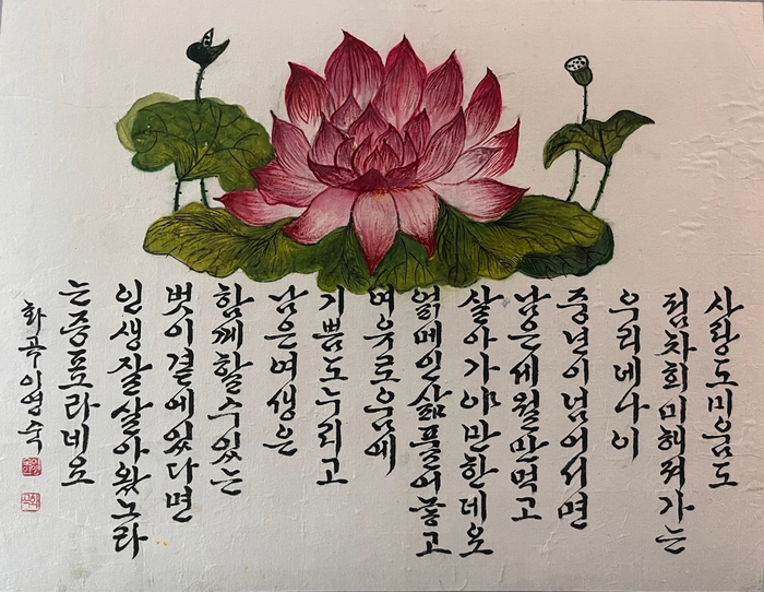 지난해 12월, 대구 달서구 진천동 행정복지센터 복도에 특별한 전시회가 열렸다. 진천동 행정복지센터에서 운영 중인 서예교실 수강생들의 작품 약 20점이 전시된 것이다. 그 중에서도 연꽃을 배경으로 한 한 작품이 유독 눈길을 끌었다. 센터에서 근무 중인 한 공무원은 "서예교실의 강사를 맡고 있는 서예가의 작품"이라며 귀띔했다.