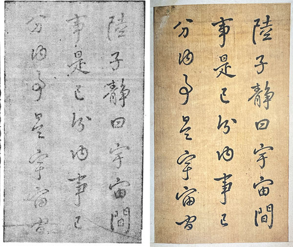 위쪽에는 《다산친필계자첩(茶山親筆戒子帖)》의 한 면을 수록했고, 그 아래 사진에는 ‘다산 부인 홍혜완(洪惠婉)씨가 다산 강진 적중(謫中)에 보낸 4언 시첩 일부’라는 설명과 함께 해당 시의 끝부분 여섯 구절이 실려 있었다. 본문 어디에도 이 글씨가 여기에 어떤 맥락으로 들어갔는지, 소장자가 누구인지에 대한 설명은 전혀 찾아볼 수 없었다.