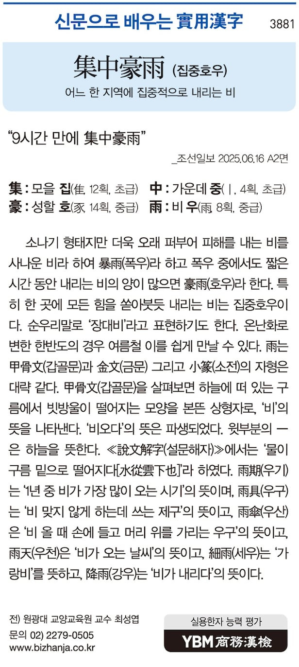신문으로 배우는 실용한자] 집중호우(集中豪雨)