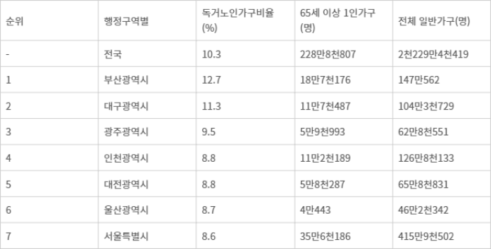 23일 국가데이터처 국가통계포털(KOSIS)에 확인 결과, 2024년 기준 전국 전체 가구 수(2천229만4천419가구) 가운데 65세 이상 노인 1인 가구(228만8천807가구)가 10.3%를 차지했다. 이는 2020년(7.9%)보다 2.4%포인트 증가한 수치다. 특별·광역시별로 보면 부산이 12.7%로 가장 높고 대구가 11.3%로 뒤를 이었다. 이어 광주 9.5%, 인천·대전 각 8.8%, 울산 8.7%, 서울 8.6% 등의 순이었다. 특히, 대구의 경우 노인 1인 가구가 2020년 8만3천459가구에서 2024년 11만7천487가구로 4년 새 41% 증가했다.